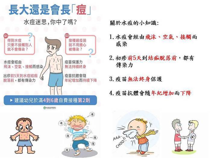 - 施打疫苗是目前預防水痘的最佳方法,出生滿1歲的幼兒應儘速由醫師評估接種。